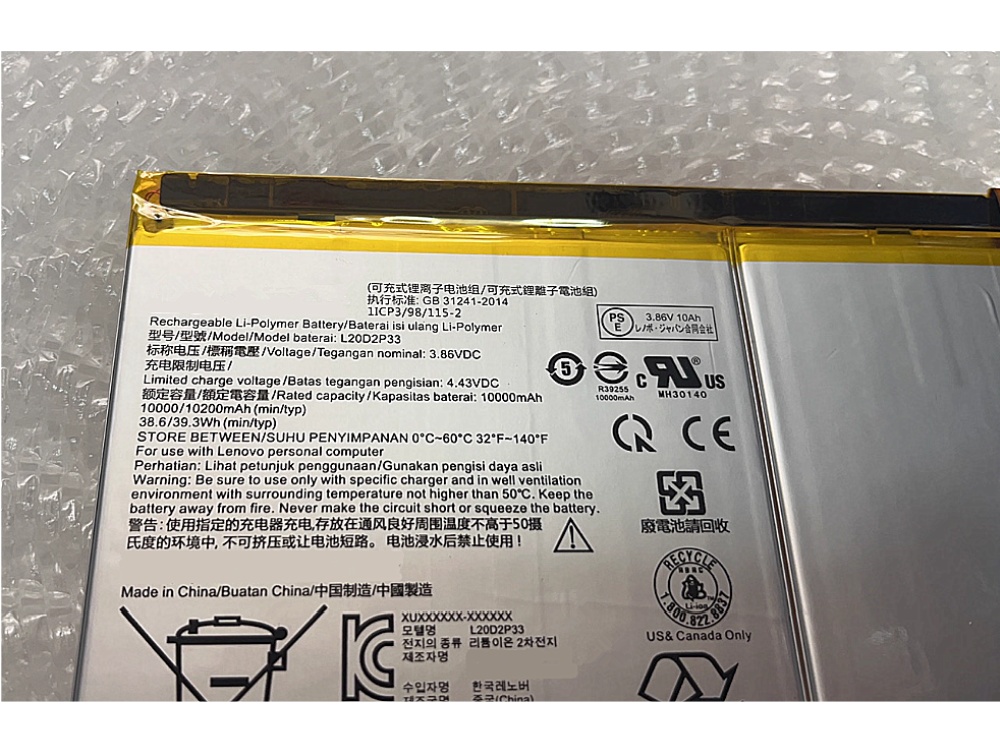 BATTERIJ LENOVO L20D2P33 - 3.86V - 10000mAh/38.6Wh - tablet pc accu